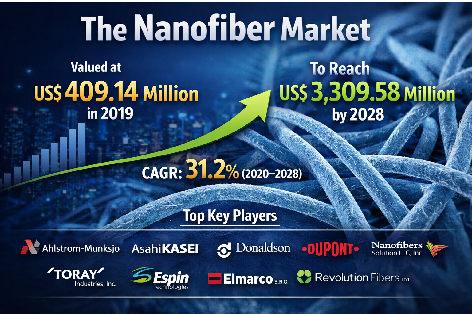 The global Nanofiber Market Is Experiencing Exponential Growth, driven by increasing adoption across high-performance applications such as filtration, healthcare, energy storage, and electronics. According to The Insight Partners, the market was valued at US$ 409.14 million in 2019 and is projected to reach US$ 3,309.58 million by 2028, registering a remarkable CAGR of 31.2% during 2020–2028. This significant rise in market size reflects the growing importance of nanofibers as a critical material in next-generation industrial and commercial solutions.
