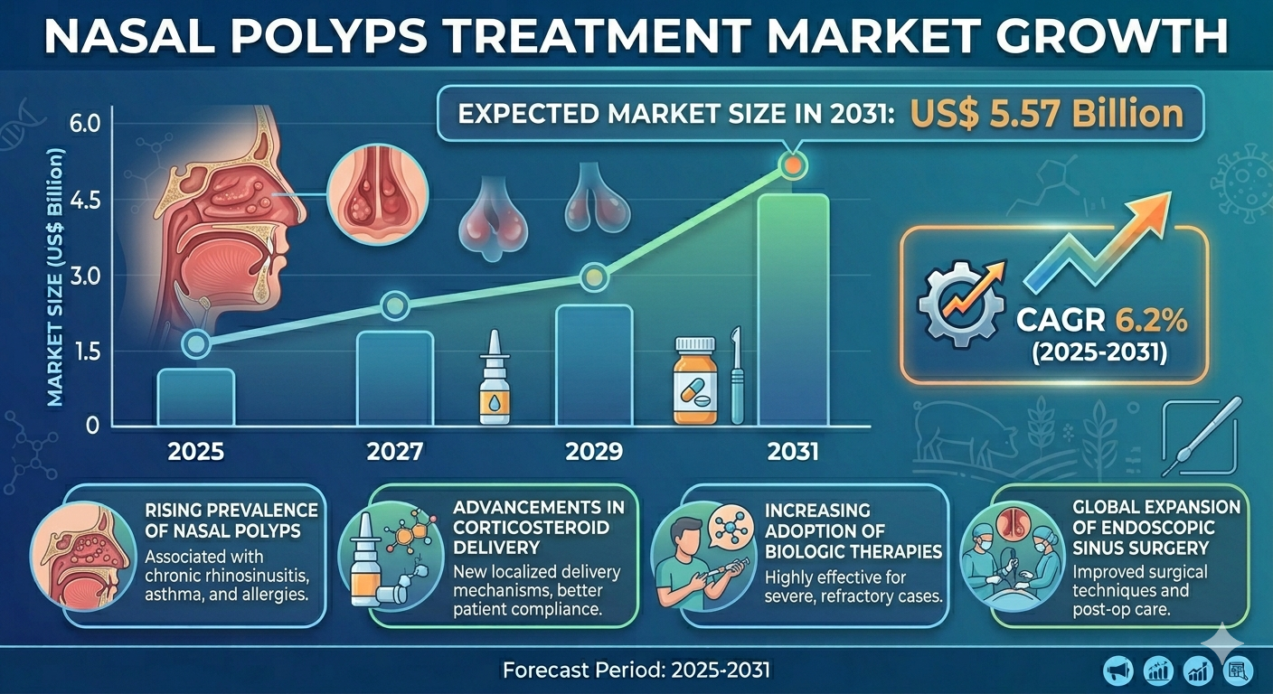 The Nasal Polyps Treatment Market is experiencing steady expansion, driven by the rising prevalence of chronic sinus conditions and inflammatory diseases. The market is projected to register a notable CAGR during the forecast period from 2025 to 2031, supported by increasing healthcare investments and advancements in biologic therapies. The growing focus on early diagnosis and targeted treatment strategies is contributing to improved patient outcomes and accelerating the growth of the Nasal Polyps Treatment Market. Additionally, the shift toward personalized medicine is playing a crucial role in enhancing therapeutic effectiveness.