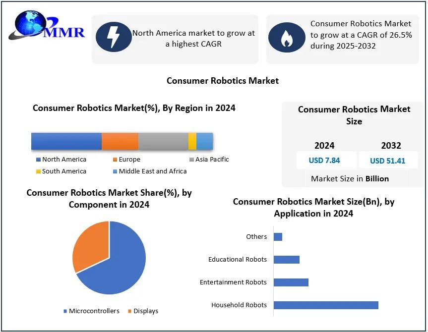 The Consumer Robotics Market was valued at USD 7.84 billion in 2024 and is projected to reach approximately USD 51.41 billion by 2032, expanding at a CAGR of 26.5% during the forecast period (2025–2032). This rapid growth is driven by increasing adoption of smart home automation devices, AI-powered robotics, and rising demand for contactless services across households and service environments.