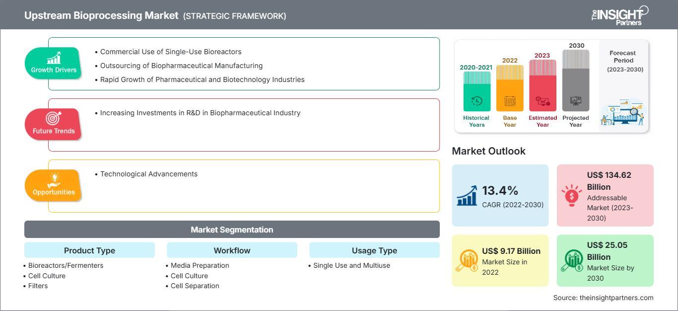 The global upstream bioprocessing market is witnessing significant expansion, driven by rapid advancements in biopharmaceutical manufacturing and increasing demand for biologics. The market is projected to grow from US$ 9,174.09 million in 2022 to US$ 25,046.69 million by 2030, registering a strong CAGR of 13.4% during 2022–2030.