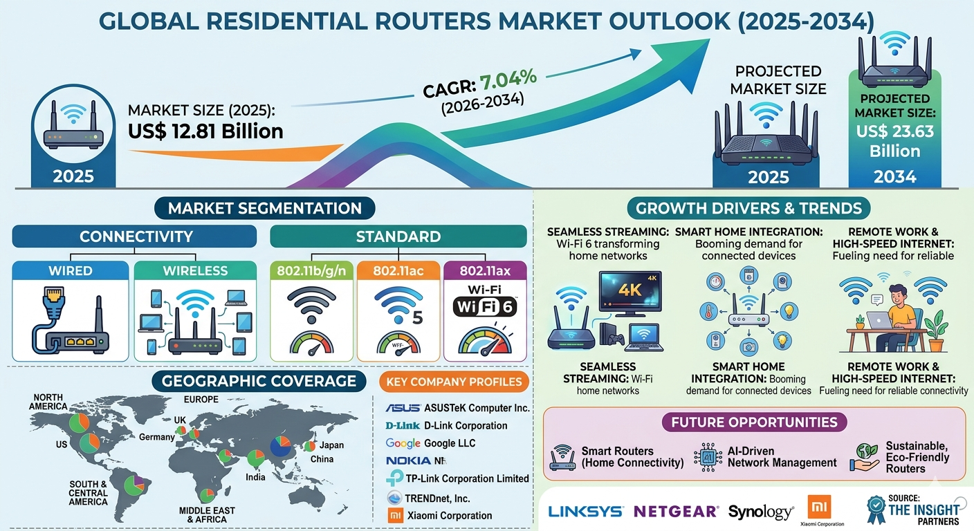 At the heart of this transformation is the Residential Routers Market Insights, which is projected to expand from US$ 12.81 billion in 2025 to US$ 23.63 billion by 2034, registering a CAGR of 7.04% during the forecast period from 2026 to 2034. North America remains a leading region in this growth trajectory, supported by high internet penetration, rapid adoption of advanced technologies, and a strong ecosystem of digital services that continue to drive demand for high-performance residential routers.