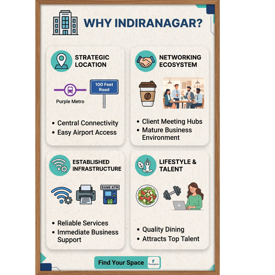 Indiranagar has become one of the most sought-after locations for coworking spaces in Bangalore. The neighborhood offers a rare combination of excellent connectivity, established business infrastructure, and a vibrant commercial ecosystem that attracts startups, freelancers, and growing companies.